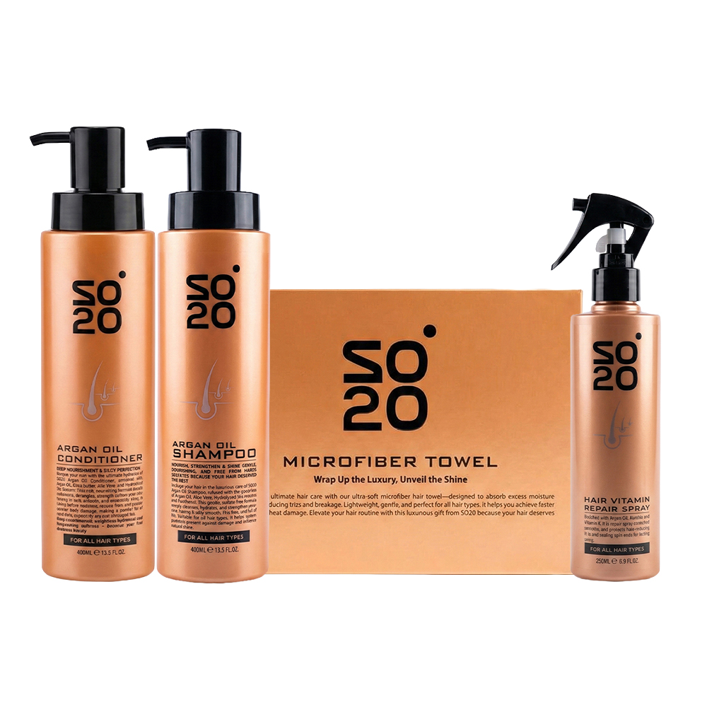 The So 20 Argan Oil Complete Hair Care Kit offers a luxurious routine for healthy, shiny hair. It starts with gentle cleansing and nourishment using So 20 Argan Oil Shampoo, followed by So 20 Conditioner for deep hydration and frizz control, and finishes with the Hair Vitamin Repair Spray to repair, protect the ends, strengthen the hair, and add long-lasting shine. The kit also includes an ultra-soft microfiber towel for faster, damage-free drying, giving your hair maximum care, softness, and vitality with every use.
