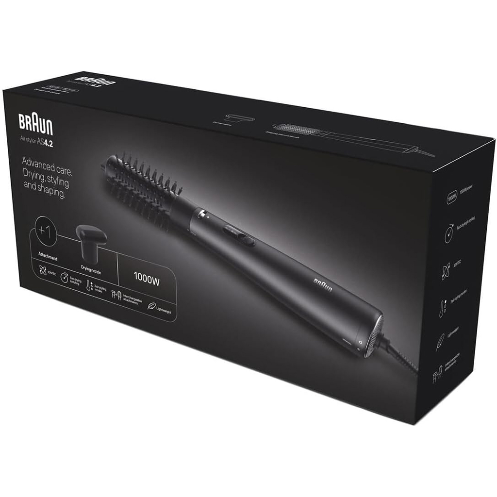 - Features: Hot-air hair brush with a drying attachment and a styling brush attachment for straightening and curling, operating at 1000 W and equipped with ionic technology to reduce frizz, enhance shine, and protect hair during styling.
